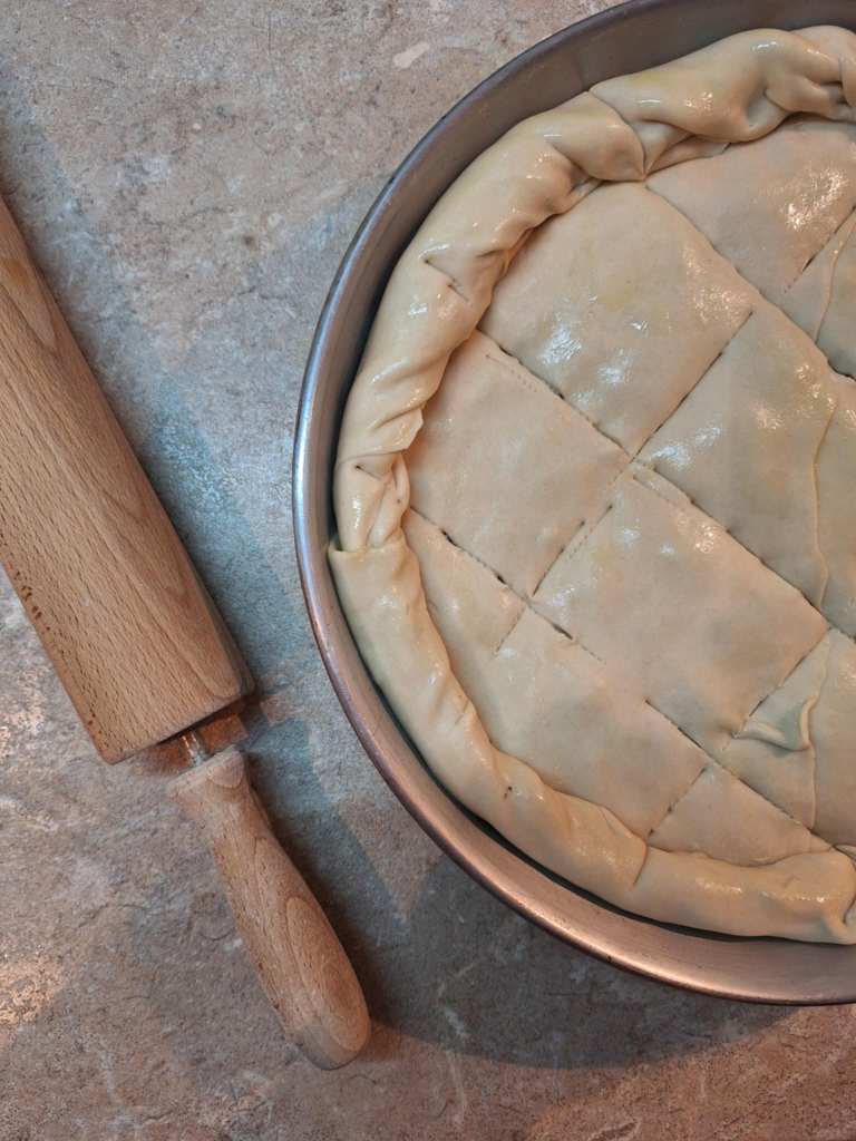 Αν ανοίξετε δικό σας φύλλο μπορείτε να βάλετε στο κάτω μέρος δύο φύλλα και να κλείσετε την πίτα σας με τα άλλα δύο γυρίζοντας γύρω γύρω το φύλλο που περισσεύει από το ταψί.