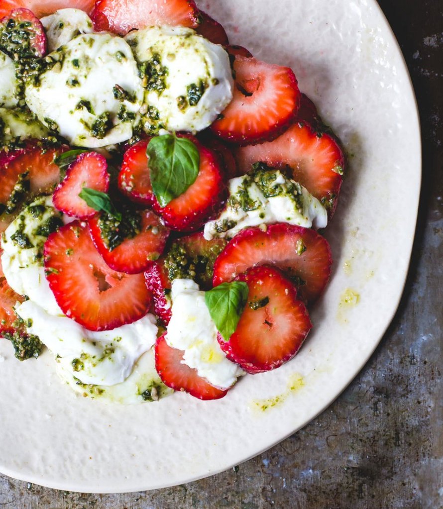 Σαλάτα Caprese αλλιώς, μια παραλλαγή που αφορά την εποχή καθώς εκτός από ντοματίνια, μοτσαρέλα, φύλλα βασιλικού και λάδι προσθέτεις ψιλοκομμένες φράουλες και παξιμάδι που απογειώνουν τη γεύση και την κάνουν κάπως πιο χορταστική με το τελευταίο ελληνικό στοιχείο να υπερισχύει.